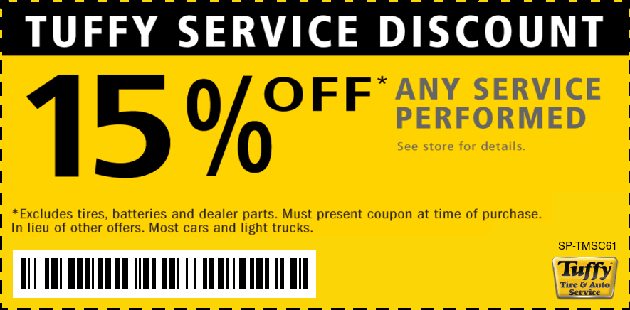 Good only atTuffy Millard Schedule Service Print coupon Share to Google Share to Facebook Share to Yelp Offer details 15% OFF Any Service Performed * See coupon for exclusions. Email Coupon First name * Last name * Email address * Sign me up to receive future offers via text from Tuffy Millard: Via Text Cell/Mobile Phone By clicking "I accept" below, I expressly agree to receive marketing text messages made by or on behalf of Tuffy Millard to the telephone number(s) I’ve listed above. I understand that I may receive such text messages by the use of Automatic Telephone Dialing Systems (including “Predictive Dialers” or “Autodialers”) and I agree to receive them even if I have registered my number(s) with my state or federal Do-Not-Call list(s). I understand that such text messages will include advertising containing offers for goods or services and that I may revoke this consent at any time by telephone, return text message or by Visiting tuffymillardave.com/stop to unsubscribe. Message and data rates may apply. I also understand that I am NOT required to provide this consent as a condition of purchasing goods or services. I accept View: Text Specials Terms and Conditions with this link.